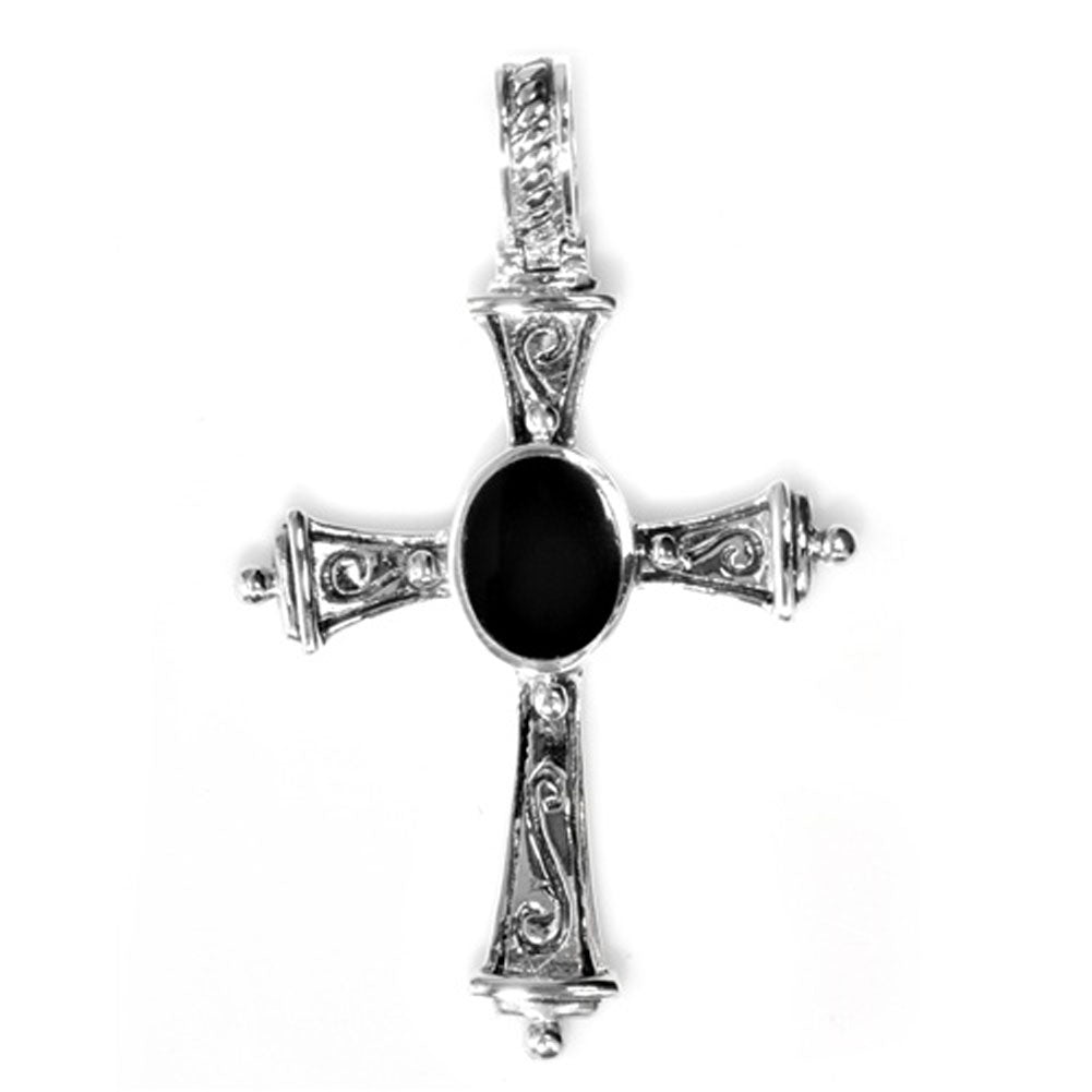 Sterling Silver Tapered Gothic Oval Cross Pendant Black Simulated Onyx Charm