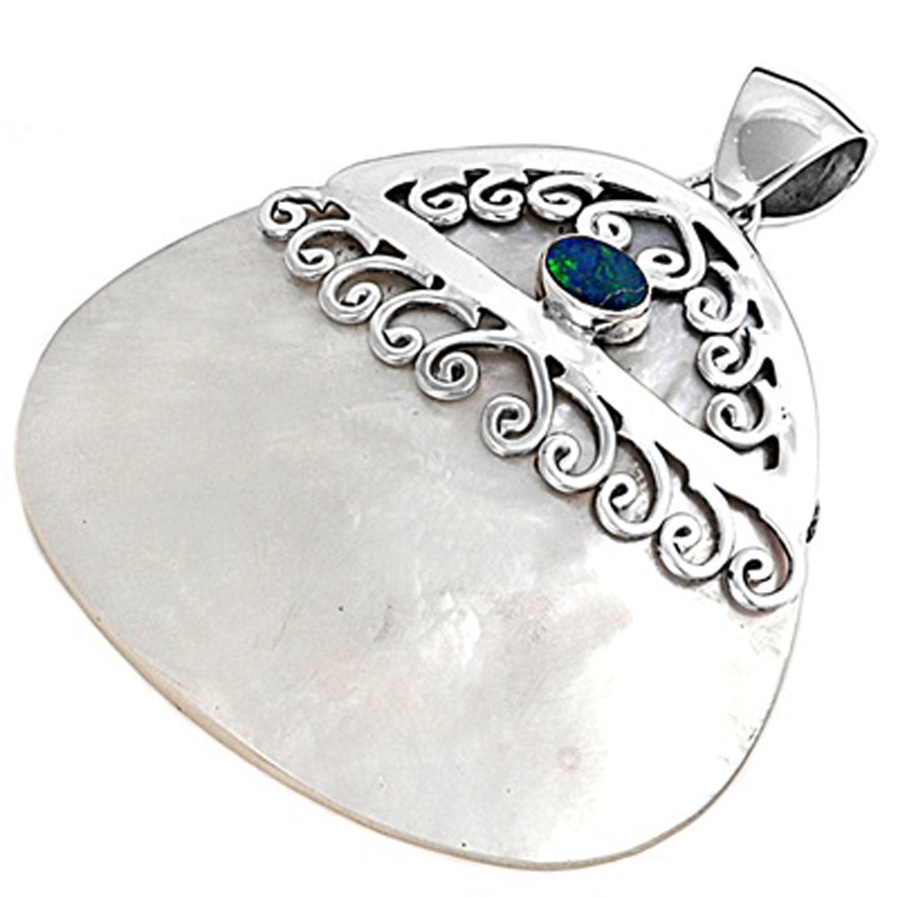 Sterling Silver Filigree Swirl Heart Oval Pendant Simulated Mother of Pearl