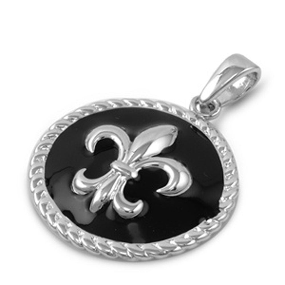 Fleur De Lis Pendant Black Simulated Onyx .925 Sterling Silver Lily Rope Charm