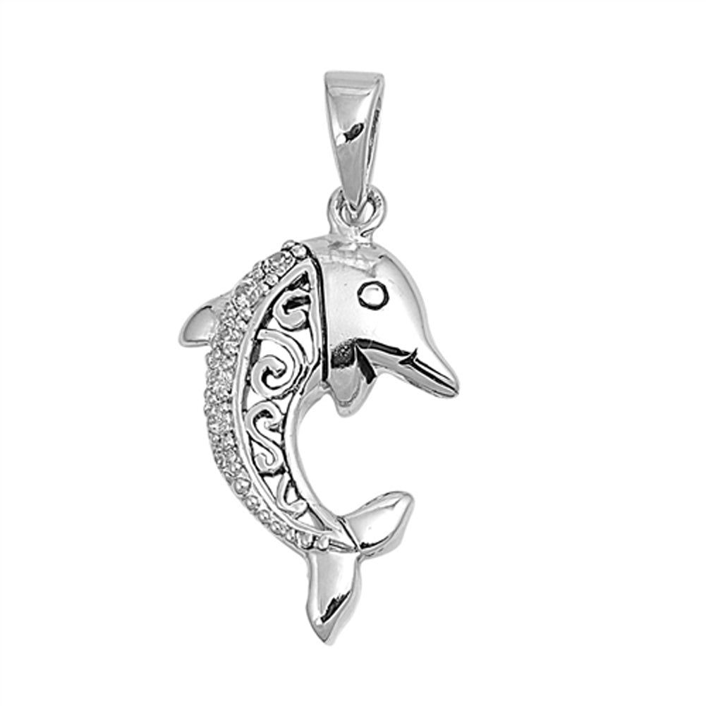 Sterling Silver Filigree Dolphin Celtic Wave Pendant Clear Simulated CZ Charm