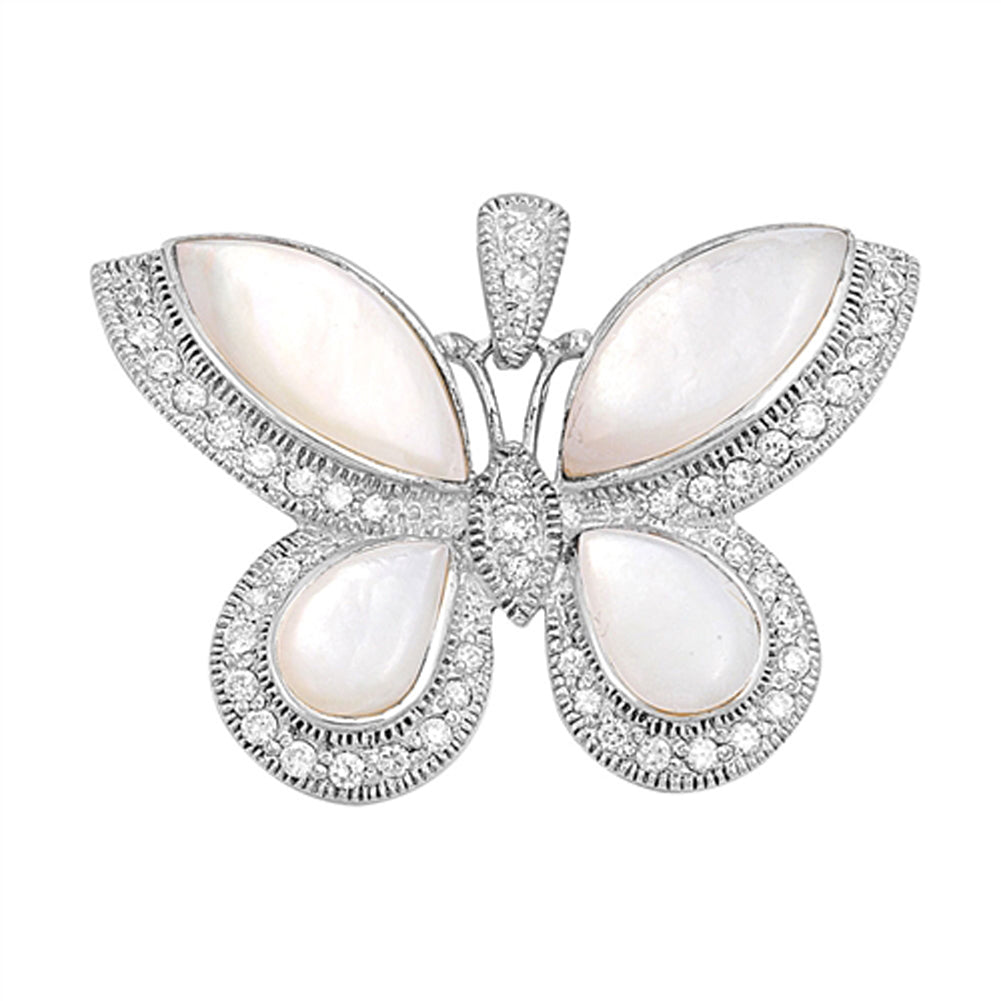 Sterling Silver Detailed Fancy Butterfly Simulated Mother of Pearl Pendant Charm