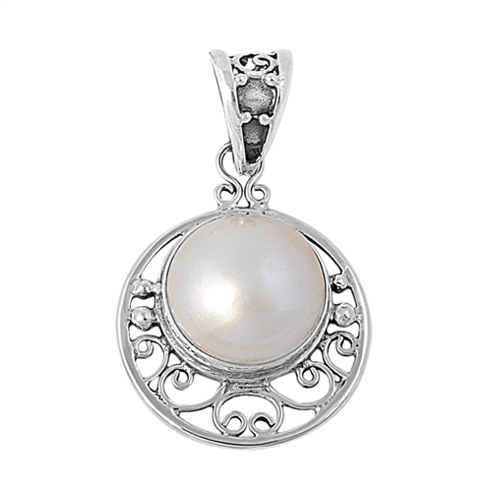 Sterling Silver Filigree Swirl Offset Double Circle Pendant Simulated Pearl