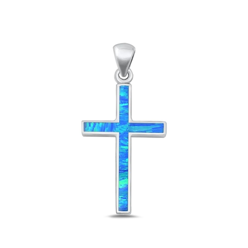 Sterling Silver High Polished Blue Lab Opal Cross Pendant .925 New Faith Charm