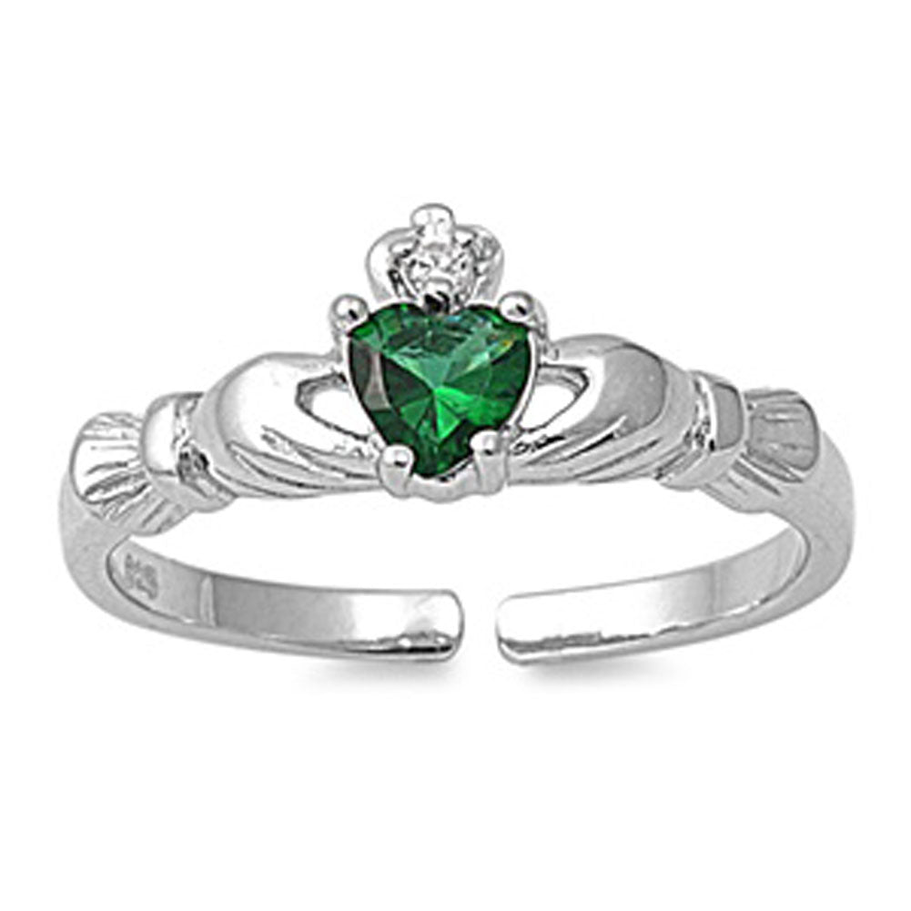 Heart Solitaire Claddagh Simulated Emerald Clear Simulated CZ .925 Sterling Silver Toe Ring